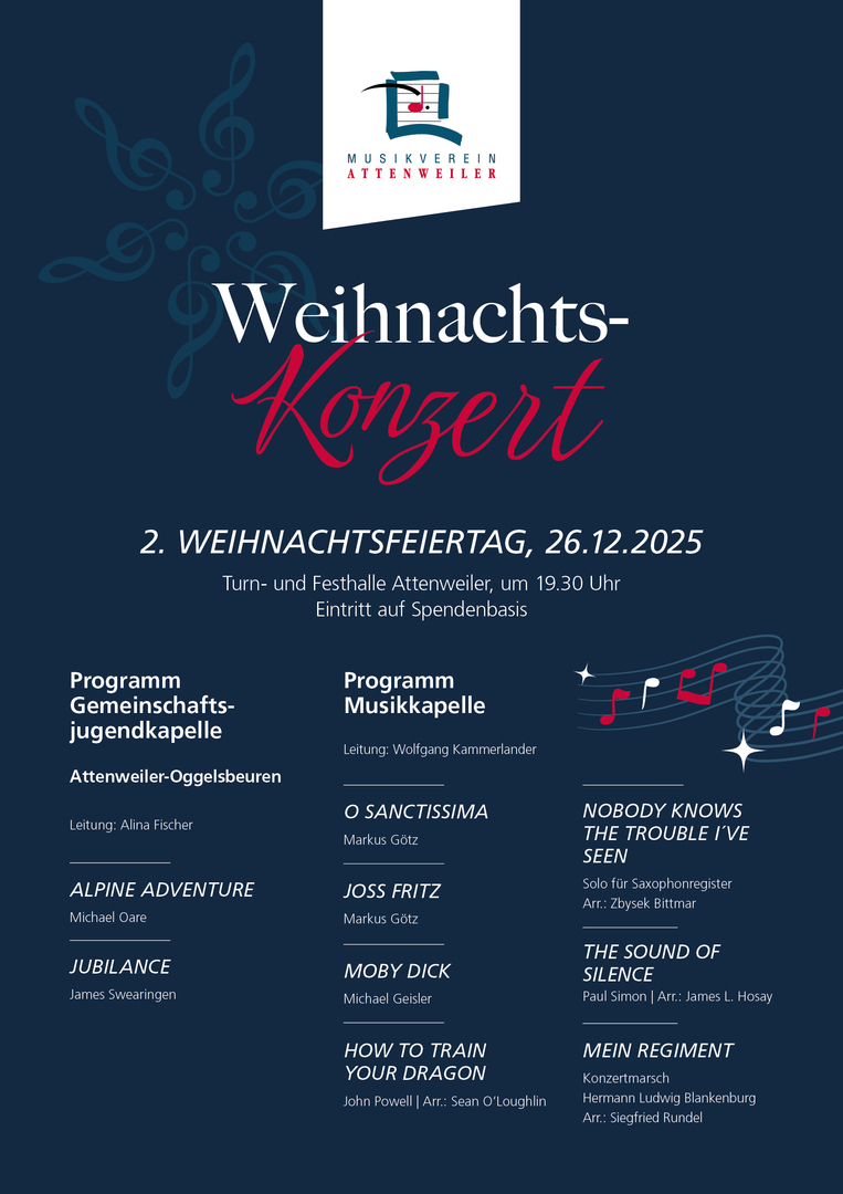 Der Musikverein Attenweiler lädt herzlich zum traditionellen Weihnachtskonzert am 26. Dezember 2025 um 19:30 Uhr in die Turn- und Festhalle Attenweiler ein.