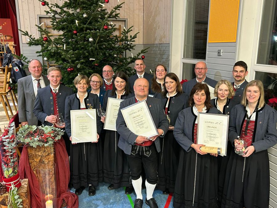 Vor der Pause standen die Ehrungen verdienter Vereinsmitglieder an, die von Walter Engeser durchgeführt wurden. Die Ehrennadel in Bronze für 10 Jahre aktive Tätigkeit erhielt Fabian Gerster; die silberne Ehrennadel für 20 Jahre aktive Tätigkeit ging an Silke Branz, Sabrina Fiederer, Lukas Pfarr, Viola Pfarr und Christine Weber; die Ehrennadel in Gold für 30 Jahre aktive Tätigkeit wurde an Gerhard Bleher, Andreas Motzet und Carina Schilling verliehen; die Ehrennadel in Gold mit Diamant für 40 Jahre aktive Tätigkeit wurde an Elke Gerster, Anke Nusser und Bärbel Reklau verliehen. Die Dirigentennadel in Gold mit Diamant für 25 Jahre aktive Tätigkeit erhielt an diesem Abend Wolfgang Kammerlander. Klaus Gerster und Anja Reklau erhielten die Förderermedaille in Bronze für zehn Jahre in der Vorstandschaft.